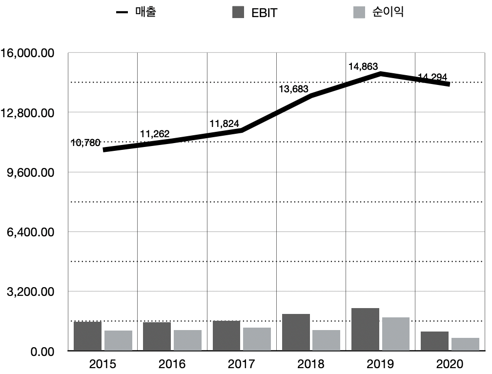 회계년도 2015년부터 2020년 사이에 매출이 연평균복합성장율 5.81%로 늘었다. 회계년도 2020년 실적이 Covid-19로 인해 크게 영향을 받았음을 감안해도 매출 성장율이 높은 편은 아니라는 점을 알 수 있다. 순이익율은 대략 10% 안팍 수준.